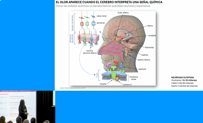 Durante su presentación, López Mascaraque realizó un recorrido por la ciencia que estudia el sentido del olfato, abordando cómo los olores influyen en nuestra percepción del mundo, en nuestras emociones y en la memoria. La investigadora destacó el papel del olfato como uno de los sentidos más antiguos desde el punto de vista evolutivo y explicó cómo los estímulos olfativos están estrechamente conectados con regiones cerebrales implicadas en la memoria y las emociones.